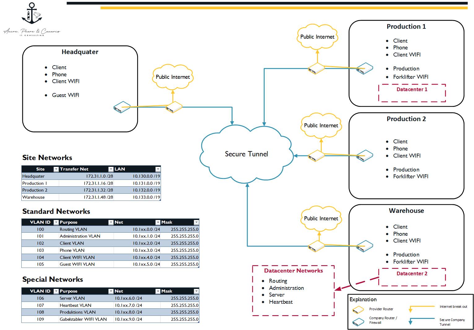The underlaying expertise stretches over the most relevant IT based systems for typical companies. We design Company LAN Networks, connect them via the internet to other sites and branch offices via secure tunnels or connect them with your cloud services.